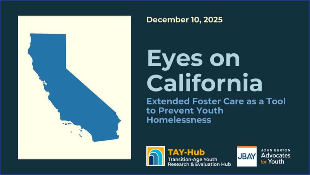 This webinar featured a study from the Transition-Age Youth Research and Evaluation Hub (TAY-Hub), which conducted an analysis linking CalYOUTH and state administrative data to better understand how extended foster care and the types of placements young people receive shape their risk of homelessness.
