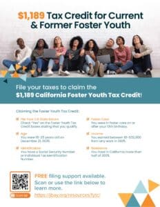 This outreach flyer provides information about the California Foster Youth Tax Credit, which in 2026 provides up to $1,189 to eligible current and former foster youth ages 18-25 who file their state taxes.
